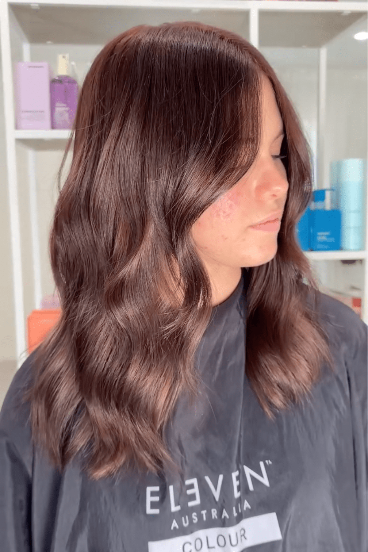 In the salon, I usually create this look by layering a warm red-brown gloss over a chocolate base or adding a few warm-toned lowlights for extra dimension. It reflects just enough light to look elevated but never too bold. To keep the tone from turning brassy, use a sulfate-free shampoo and a weekly color-safe glossing treatment.