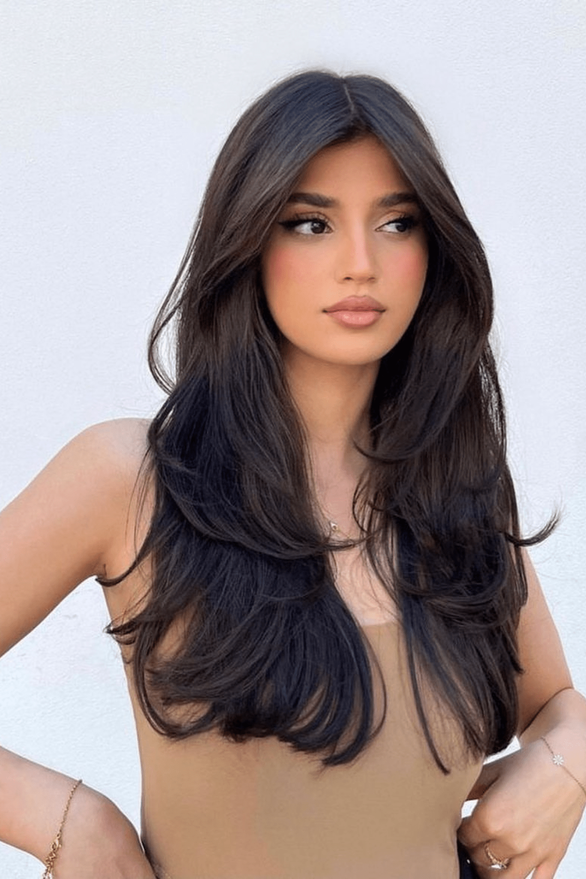 The Butterfly cut with face-framing layers that start at the cheekbones and cascade into long, airy lengths. The cut’s weight stays low so frizz doesn’t balloon, while the top layers create bounce and softness that flatter without adding width.