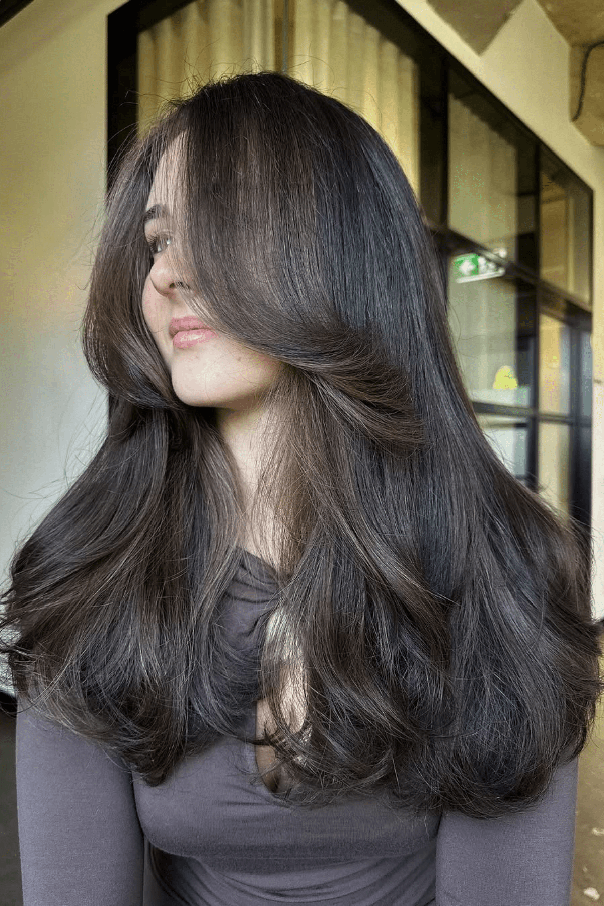 This is the smoothest, most fluid long cut you can get; soft, blended layers that flow into each other so there’s no harsh shelf for frizz to cling to. The ends are rounded and weighty enough to stay sleek, even when the air’s thick with humidity.